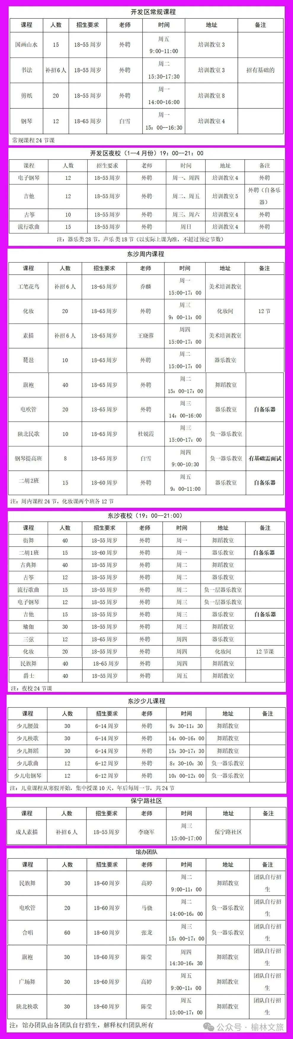 为进一步拓展全民艺术普及覆盖面,提升广大市民群众的艺术鉴赏水平,榆林市文化馆全民艺术普及从2026年开始除了开设白天的课程外,夜校也将于近日开班,欢迎大家报名参加!具体课程如下: